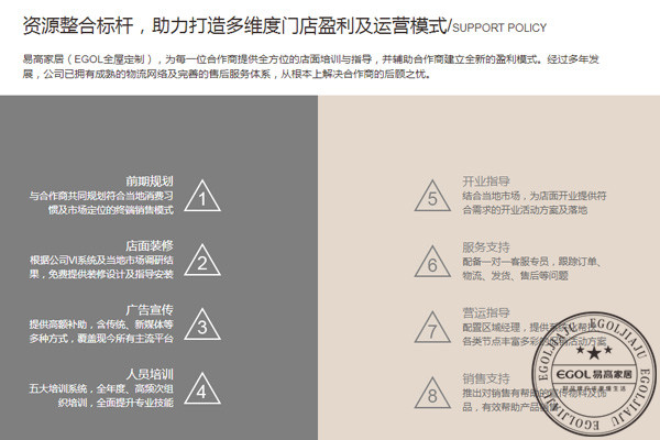對于加盟商來說,可靠的企業(yè)是他們的后盾,但是對于企業(yè)來說加盟商是他們發(fā)展的基石。有的定制家具企業(yè)往往忽視兩者之間的關(guān)聯(lián)。只有能看透本質(zhì)的定制家具企業(yè)才能發(fā)展壯大,易高家居對于定制家具加盟商提供全面化的扶持政策:前期規(guī)劃-店面裝修-廣告宣傳-人員培訓(xùn)-開業(yè)指導(dǎo)-服務(wù)支持-營運(yùn)知道-服務(wù)支持等,攜手廣大加盟商共創(chuàng)未來。全面扶持政策作為定制家具發(fā)展新規(guī)劃|發(fā)展前景之一,你了解到了嗎?