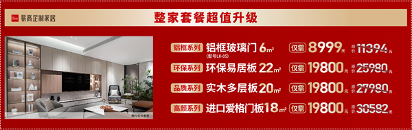 為滿足大家個性化、多樣化的定制需求,易高家居貼心推出不同系列的整家升級產品,在板材方面,僅需19800元就能分別升級22㎡環(huán)保易居板、20㎡實木多層板、18平米進口愛格板,環(huán)保、品質、高顏系列風格百變、豐富配色隨心選。原價11394元的6㎡鋁框玻璃門更是僅需8999元就能帶走,巔峰鉅惠開啟家居大狂歡,可以猶豫,但是別錯過!