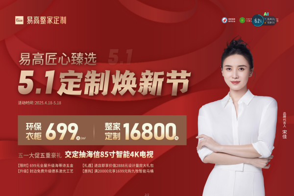 五一家裝季,易高定制煥新超前享。2025年4月18日——5月18日,易高整家定制“5.1定制煥新節(jié)”“放價”活動上線,解鎖環(huán)保衣柜699元/㎡超低定制價。匠心臻選,大牌定制福利購。