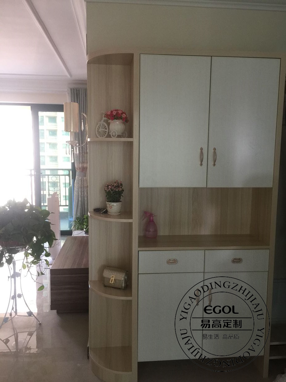 入門處做的定制的鞋柜,配上轉(zhuǎn)角柜,讓整個柜體顯得圓滑,也不容易傷人,下面鏤空,就是為了放換下來的鞋子。