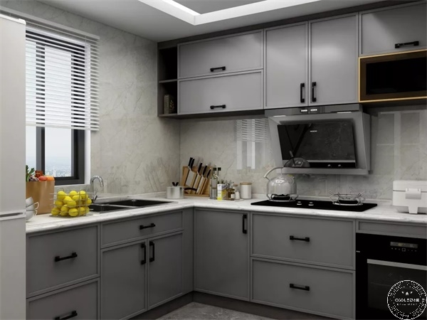 廚房要方便做飯,有足夠的空間放置物品。設(shè)計的關(guān)鍵在于利用空間定制操作臺面,打造吊柜。