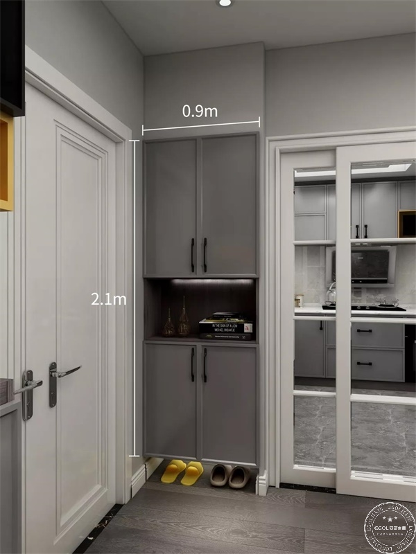 下方是鞋柜,中間是鏤空的展示區(qū)。展示區(qū)是主人表現(xiàn)個性的天地,可以根據(jù)自己的愛好、情調(diào)來打造,同時也為客廳增添了一道獨特的風(fēng)景線。