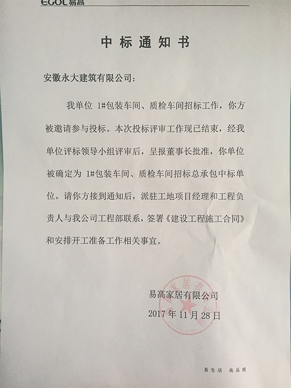 我單位1#包裝車間、質(zhì)檢車間招標(biāo)工作,你方被邀請(qǐng)參與投標(biāo)。本次投標(biāo)評(píng)審工作現(xiàn)已結(jié)束,經(jīng)我單位評(píng)標(biāo)領(lǐng)導(dǎo)小組評(píng)審后,呈報(bào)董事長批準(zhǔn),你單位被確定為1#包裝車間、質(zhì)檢車間招標(biāo)總承包中標(biāo)單位。請(qǐng)你方接到通知后,派駐工地項(xiàng)目經(jīng)理和工程負(fù)責(zé)人與我公司工程部聯(lián)系,簽署《建設(shè)工程施工合同》和安排開工準(zhǔn)備工作相關(guān)事宜。